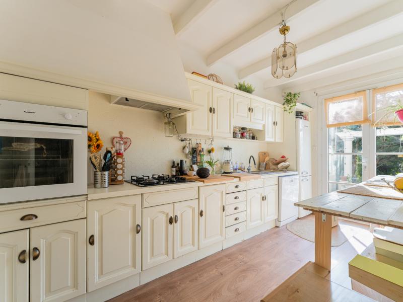 La maison, mitoyenne d’un côté, se compose au rez-de-chaussée d’une entrée, d’une chaufferie, d’un séjour lumineux et d’une cuisine aménagée et équipée (plaques de cuisson au gaz, four). À l’étage, vous trouverez trois chambres, une salle de bains ainsi qu’un WC indépendant.