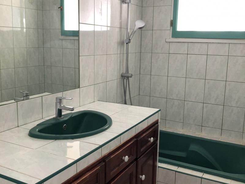 La salle de bains est carrelée , avec meuble sous vasque, baignoire et fenêtre.