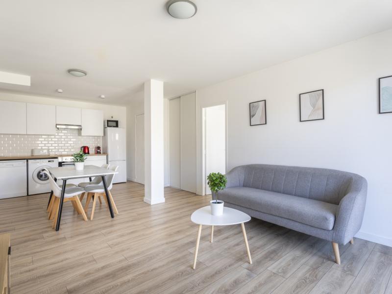 Au 1er étage sans ascenceur, cet appartement se compose d'une entrée desservant une belle pièce de vie avec cuisine américaine équipée et méublée (plaque, hotte, four, micro-onde, frigo, machine à laver, lave vaisselle) ouvrant sur un balcon de 11 m2, 2 salles d'eau et 3 chambres, elles sont équipées de literies en trés bon état, d'un bureau et de rangements.