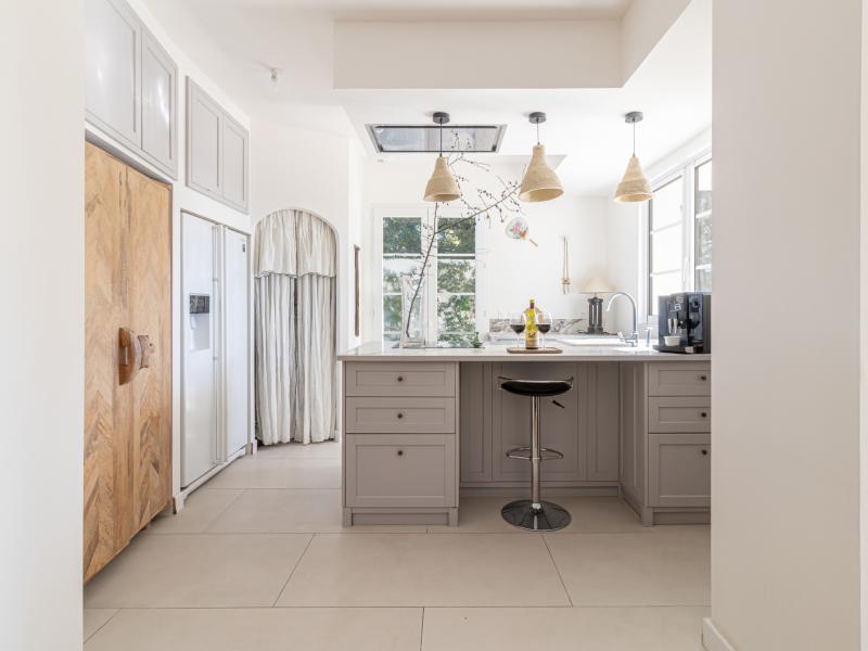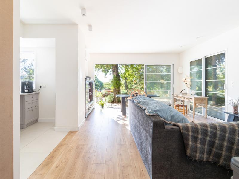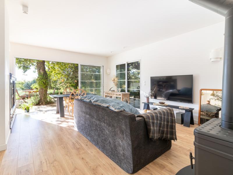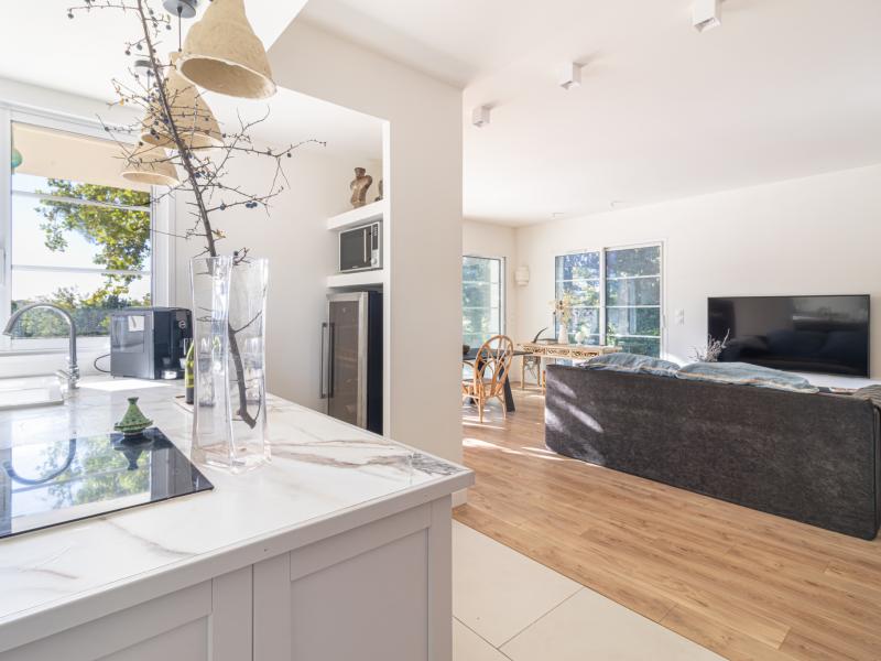 Elle se compose d’une entrée avec vestibule, d’une cuisine ouverte sur un vaste séjour baigné de lumière grâce à sa grande baie vitrée, prolongeant naturellement l’espace vers une superbe terrasse de 200 m2, entourée de verdure et ombragée par un chêne majestueux.